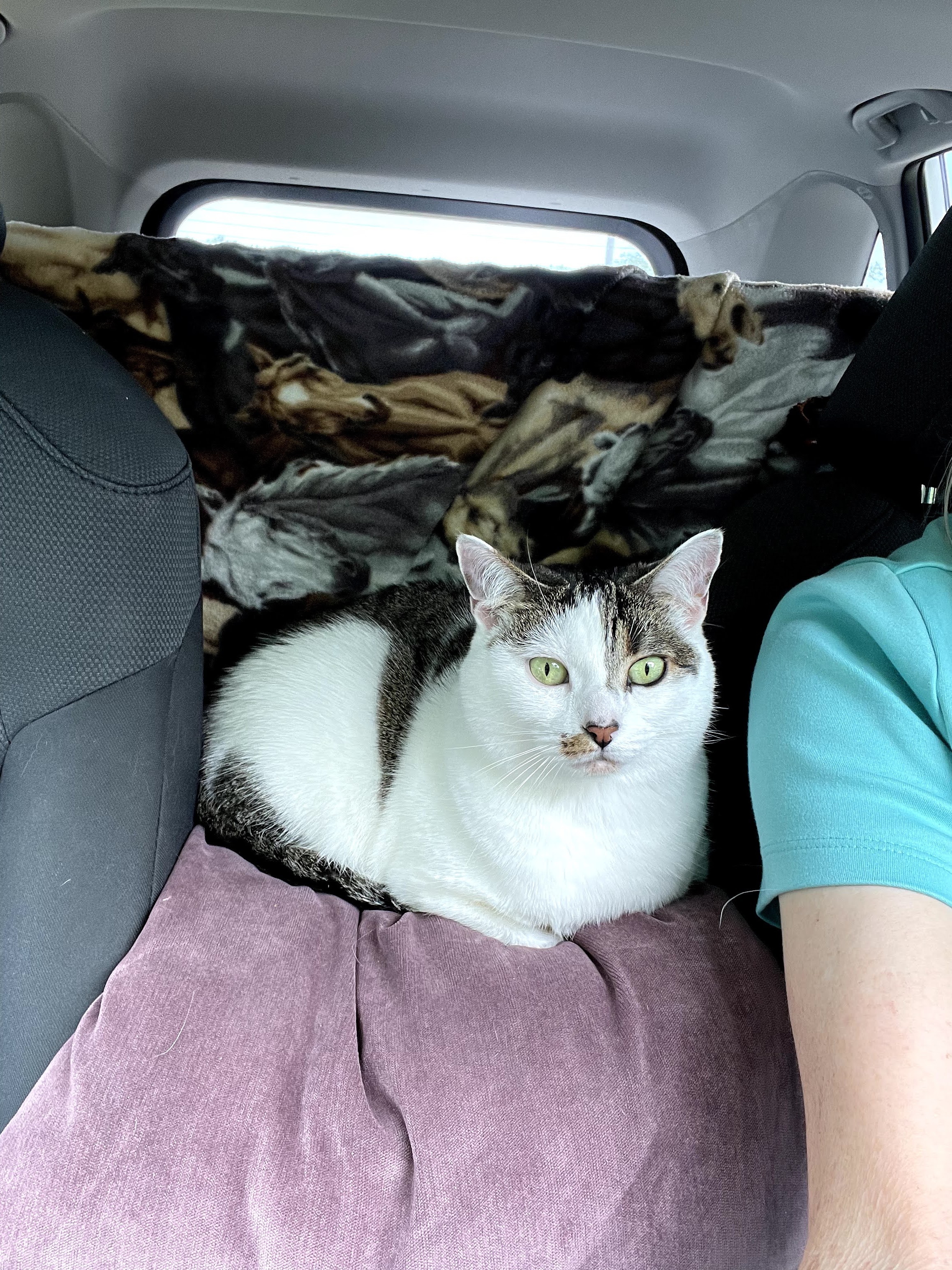 We pulled out at 8:15am. After I was in the car, I explored a bit. I am a curious cat, after all. Then I settled on mom’s lap or on a pillow on the console area. I was awake most of the day until about 2 then I settled down and had a good nap. Now that we are in our hotel room, I’m exploring more and very affectionate. But mostly hiding under the bed. It’s safer just in case you know!